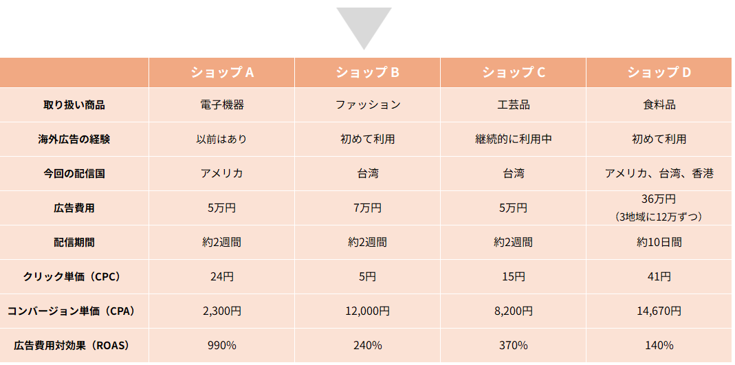 こちらでは、Meta広告で海外に向けて広告配信を行った4つのショップの事例を、実際のデータとともにご紹介します。