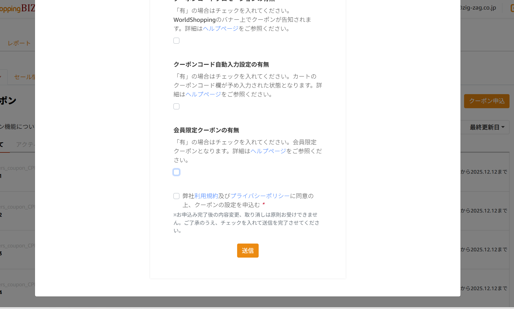 その際に「会員限定クーポンの有無」の枠が追加されていますので、チェックを入れると、WorldShoppingに会員登録したユーザーにみ利用できるクーポンの発行ができるようになります。
