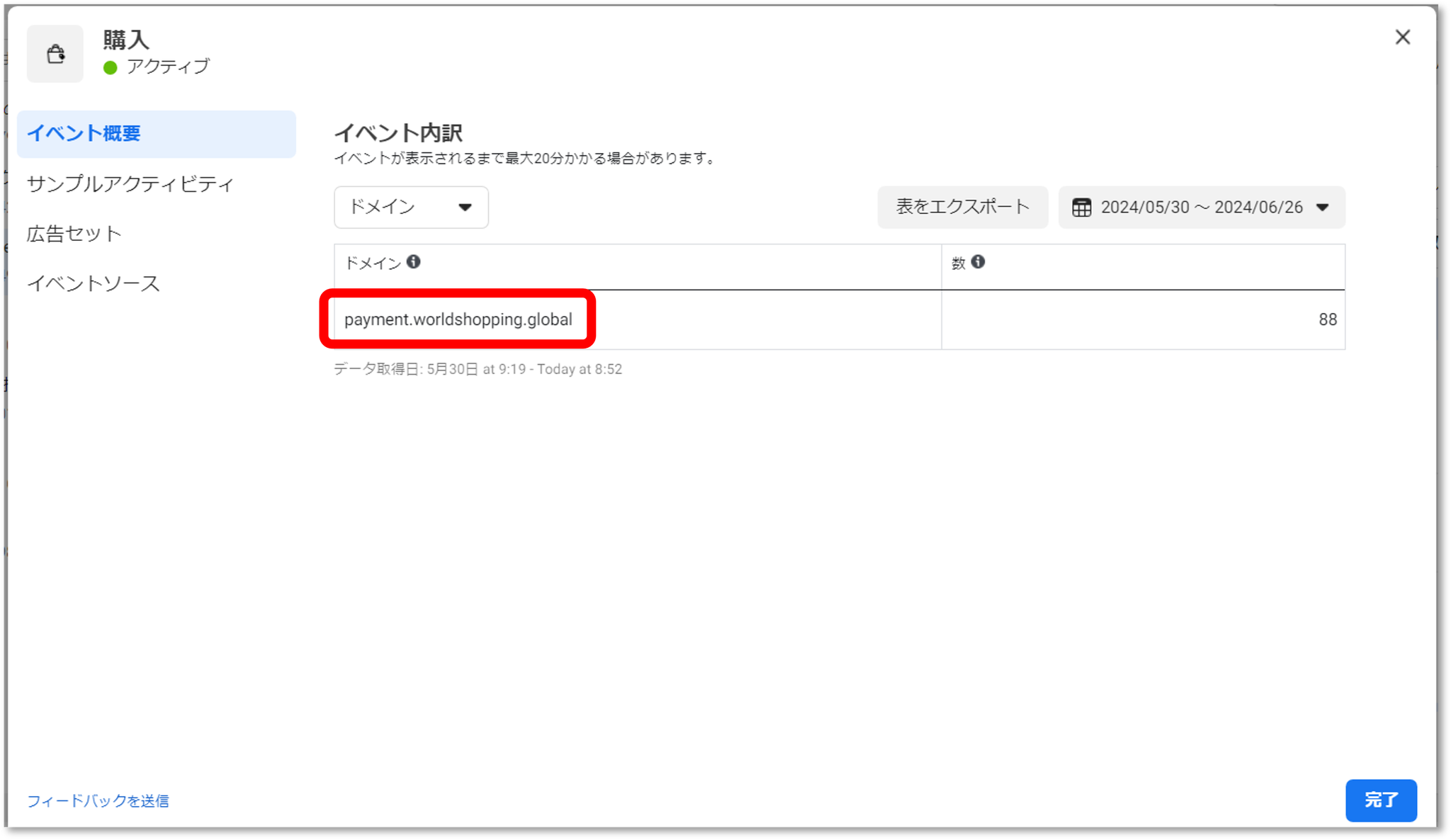 WorldShopping上でコンバージョンが発生すると、イベントマネージャーで「payment.worldshopping.global」ドメインのイベントが記録されます