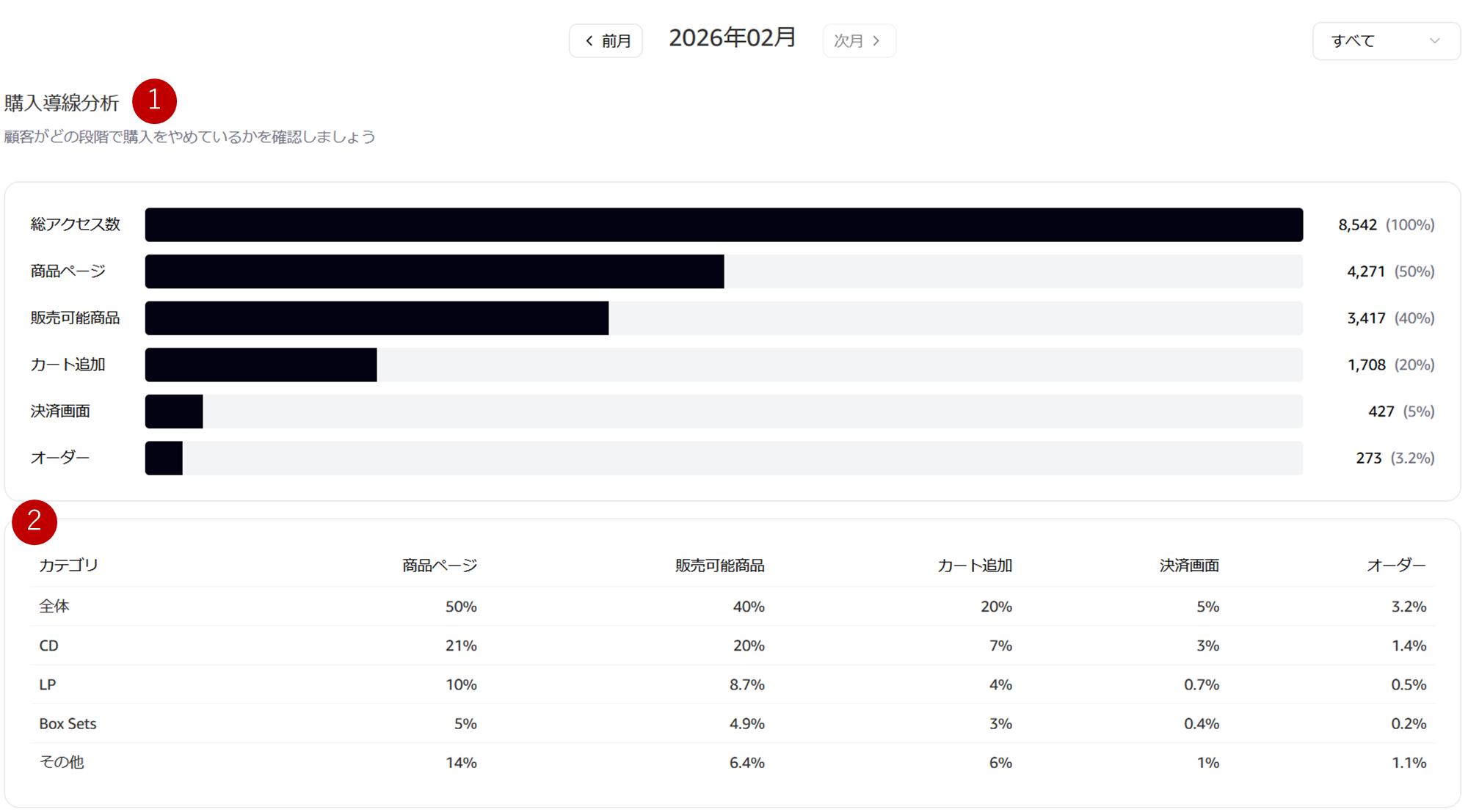 カテゴリ別に商品ページから購入数(オーダー数)までの推移がわかります。