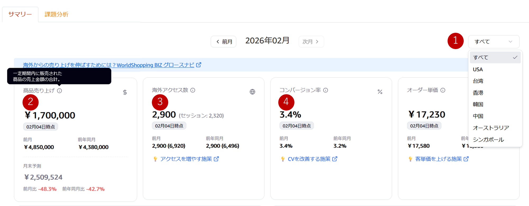① 購入導線分析は海外カスタマーがショップにアクセスしてきた数(PV数)から