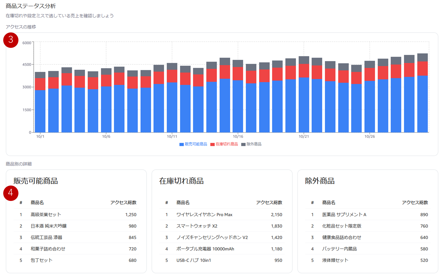 ④ 販売可能商品・在庫切れ商品・除外商品をそれぞれアクセス数の多い順に