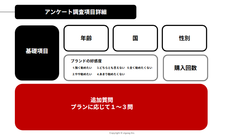 アンケートは「基礎項目」をベースに、追加項目を組み合わせて構成します。