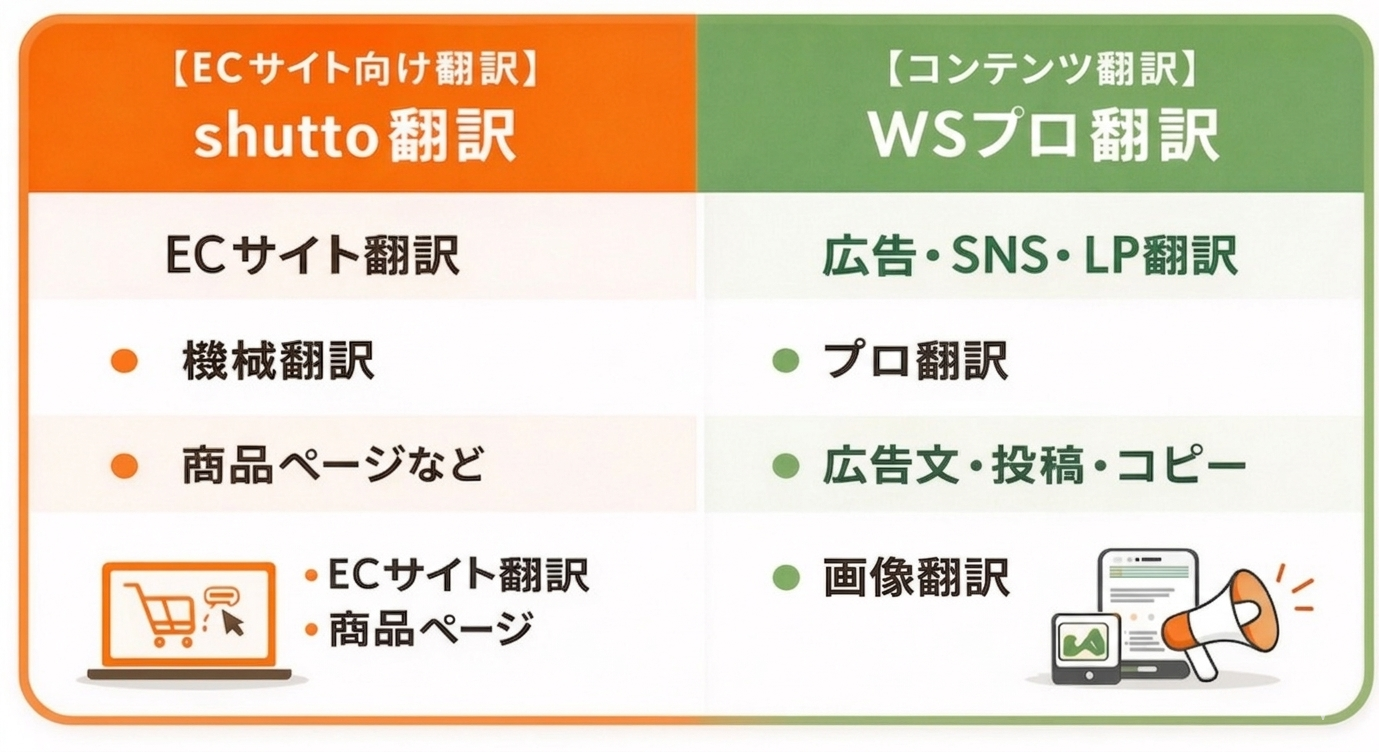 それぞれの特性に応じて、サイト翻訳はshutto翻訳、マーケティング用途はWSプロ翻訳、